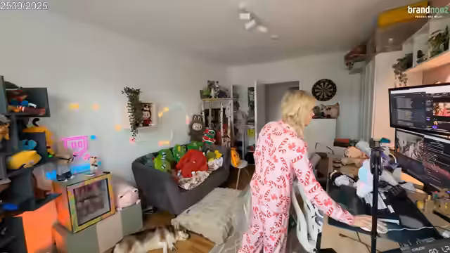 03:08:07Ein großes Thema des Streams ist das Aufräumen des Streaming- und Schlafzimmers. Die Streamerin räumt konsequent auf, um Platz zu schaffen und den Weihnachtsmann nicht zu verschrecken. Dabei wird eine Kiste als 'Kammer des Schreckens' bezeichnet und sortiert. Es wird auch über die technische Ausstattung gesprochen, inklusive eines Laptops als Notfall-PC und der Überlegung, ein doppeltes PC-Setup einzurichten, was jedoch letztlich verworfen wird. Der Fokus liegt auf der Vorbereitung für den Besuch bei der Familie.