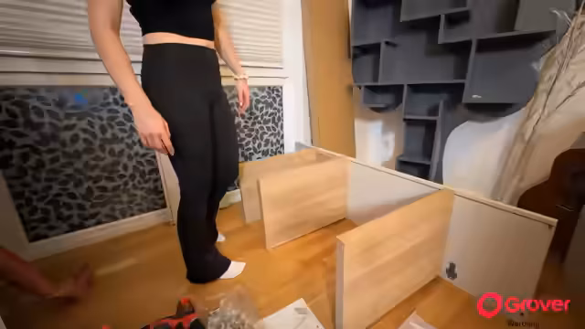 05:40:37Die Streamerin arbeitet sich durch die Schritte der Anleitung und befestigt die verschiedenen Teile des Schranks. Sie kämpft mit der Instabilität des Gerüsts und muss viel Kraft aufwenden, um die Teile zusammenzudrücken. Sie lobt das Stecksystem zunächst, ist aber frustriert über den hohen Kraftaufwand, der nötig ist, um die Teile einzuhaken. Sie vergleicht es mit dem Pax-System von IKEA, das bereits vormontierte Wände hat. Um sich zu motivieren, trinkt sie eine Knabe-Cola und bemerkt, wie ihr Hund Gnocchi entspannt auf dem Sofa liegt, während sie die ganze Arbeit erledigt. Sie beginnt mit dem Anbringen der Rückwände, was mit einem lauten Knacken einhergeht, das sie als positives Zeichen wertet. Sie verwendet ein Hilfsmittel, um die Bretter besser herunterzuschieben. Nachdem die Rückwände eingesetzt sind, ist das erste Paket des Schranks fertig. Sie muss nun das zweite Paket öffnen, das den Boden und andere Teile enthält. Sie plant, einen alten Kühlschrank hinter die Tür zu stellen und ihn später zu ihrer Schwester zu bringen, was sie als umständlich empfindet.