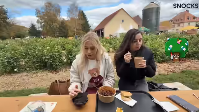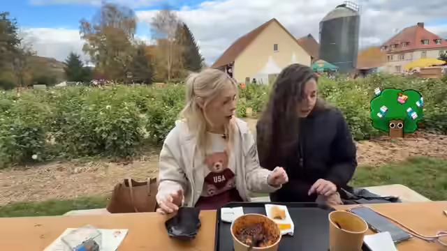 04:05:01Nachdem sie sich für ihre Mahlzeiten entschieden hatten, bezahlten die Streamerinnen rund 20 Euro für ein gemeinsames Essen, das eine Kürbissuppe, ein Gulusch und eine Bratwurst umfasste. Sie ließen sich an einem Tisch mit Blick auf den Hof nieder und probierten ihre Bestellungen. Die Kürbissuppe wurde einstimmig als absoluter Höhepunkt und "saulecker" gelobt, das Gulasch wurde als geschmackvoll und fleischig beschrieben, während die Bratwurst als normal eingestuft wurde, in der aber dennoch Kürbiskerne zu finden waren.
