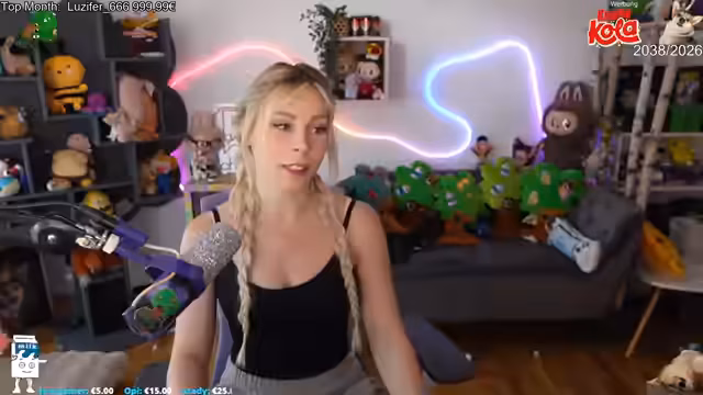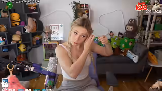 00:18:32Der Stream beginnt mit einer verspäteten Ankündigung der Streamerin, die zuvor mit Frisieren beschäftigt war. Sie begrüßt ihre Zuschauer als Gushies und Hertha und erwähnt den Sonntagmorgen, an dem sie Sorgen und Probleme loswerden möchte. Es werden Spenden und Supporter-Ereignisse erwähnt, die aber ignoriert werden sollen. Die Streamerin kündigt an, sich kurz umziehen zu müssen, da sie für den heutigen Stream spezielle Kleidung, einen schwarzen Body, anziehen möchte.