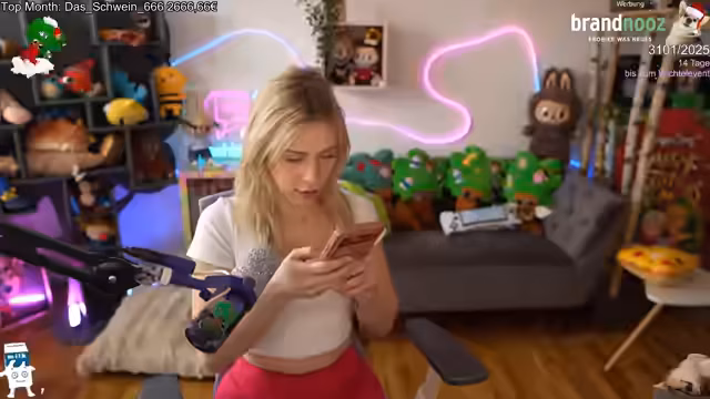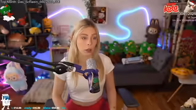 00:55:50Die Streamerin macht einen Witz über eine vermeintlich stalkende Zuschauerin namens Lilly, rudert aber schnell zurück, da sie sich an den kürzlichen Fall einer vermissten und später tot aufgefundenen Influencerin aus Österreich erinnert, die von ihrem Ex-Partner getötet wurde. Sie betont, dass sie solche Witze in Anbetracht der aktuellen Ereignisse nicht machen möchte. Für die kommende Woche kündigt sie an, am Dienstag wahrscheinlich offline zu sein, da sie einen langen Friseurtermin hat, um ihre Haare färben zu lassen und Extensions einzusetzen. Sie erklärt, dass ihr die meisten Extensions bereits ausgefallen sind und sie sich an kurzes Haar gewöhnt hat, aber für die Feiertage und Events wieder langes Haar haben möchte. Am Mittwoch wird sie mit frischem Haar wieder im Stream sein. Sie bedankt sich bei den Spendern und kündigt an, dass sie heute noch Yoga-Übungen machen wird, die sie von den Zuschauern auswählen lässt.