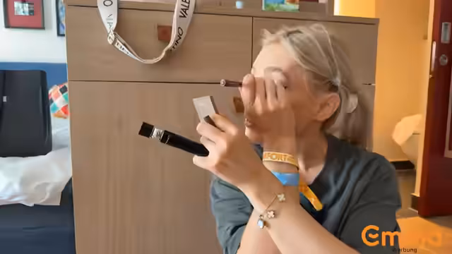 00:46:02Der Streamer entscheid sich für ein Festival-Outfit mit einem dunkelbraunen Kleid mit Nieten und Kuhbauchtasche. Er erwähnt die Herausforderungen bei der Wahl der passenden Schuhe, die er mit Cowboy-Boots löst. Vor dem Frühstück und dem Aufbruch zum Festival zeigt er seine Morgenroutine, including das Schminken mit verschiedenen Produkten wie Concealer, Puder und Eyeliner.