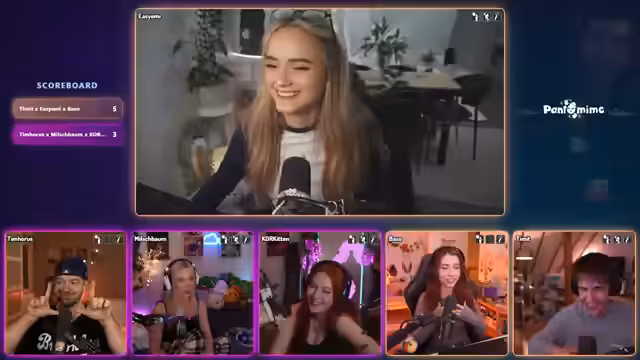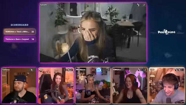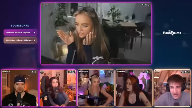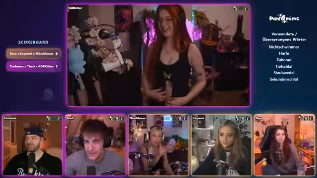 01:41:24Die Runde beginnt mit einem Pantomime-Spiel, bei dem Linda sich bemüht, Wörter zu pantomimieren, während ihre Mitspieler raten. Das Team benötigt dringend Punkte, um aufzuholen. Die Wörter wie 'Pizza', 'Fantasy' und 'Essen' werden erraten, aber bei 'Among Us' kommt es zu einer Diskussion über Spielmechaniken und Begriffe wie 'böse' und 'Verlierer'. Während des Spiels tauchen technische Probleme auf, die jedoch nicht im Detail besprochen werden, um den Spielfluss nicht zu unterbrechen.