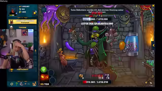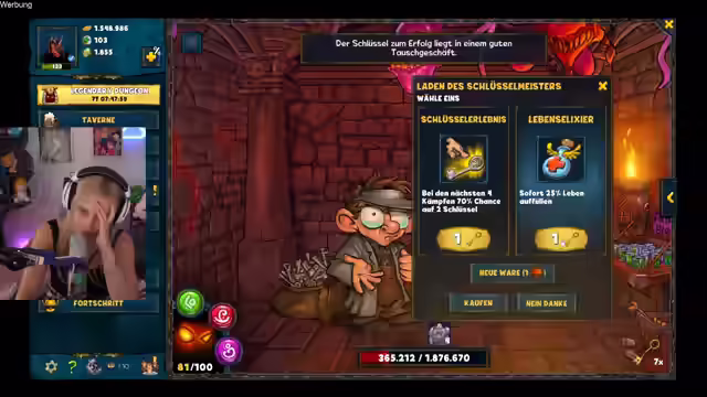 02:42:52Die Streamerin levelt ihren Charakter in Shakes & Fidget hoch und nutzt Zeituhren, um Wartezeiten zu überspringen. Sie dreht am Glücksrad, um Pilze zu gewinnen, und besucht ihre Festung, um Ressourcen abzuholen. Sie kauft Tränke für Intelligenz und Leben, wobei sie feststellt, dass sie fälschlicherweise Glückstränke gekauft hat. Trotzdem betritt sie den Legendary Dungeon und erklärt, dass dieser für 10 Tage geöffnet ist. Sie wählt verschiedene Wege im Dungeon, kämpft gegen Monster und nutzt Schlüssel, um Türen zu öffnen. Sie hat Glück mit Schlüsselmeistern und Fluchtchancen, was ihr hilft, im Dungeon voranzukommen. Sie rüstet neue Gegenstände aus und konzentriert sich darauf, den Schaden zu verringern. Sie erklärt ihre Strategie, immer den Weg zu wählen, der den Schaden reduziert und die Fluchtchancen erhöht, um möglichst weit im Dungeon zu kommen.