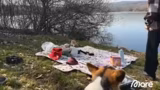 Ein Ausflug mit Hund zum See wird grillt aus