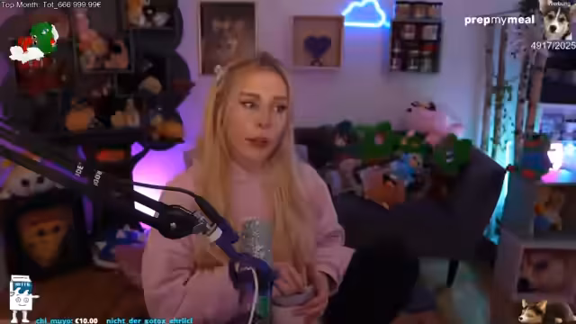 01:57:39Die Streamerin zeigt Begeisterung für verschiedene Simulator-Spiele wie 'Full HD', 'Fernbus', 'Schoolboy Runaway' und 'SCUF Simulator'. Sie unterhält sich über den Streamer Matteo von Bonjois und dessen vermeintliche Verliebtheit in sie. Später thematisiert sie die Hochzeitsplanung mit Sonja und sucht Rat, da Sonja sich im Stream anders verhält als privat. Die Konversation beinhaltet humorvolle Annahmen über ihren Ehering und Diskussionen über die finanziellen Erwartungen Sonjas.