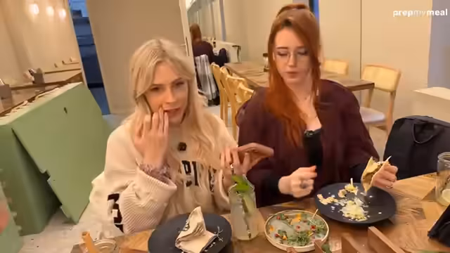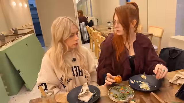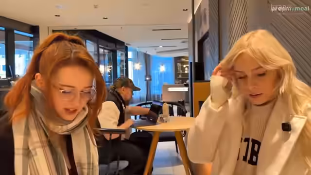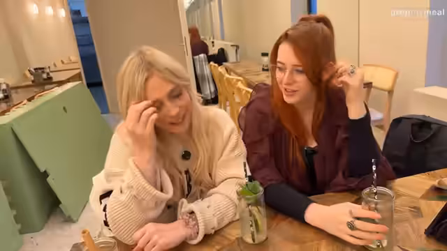 02:07:04Nach einer humorvollen und etwas derben Unterhaltung über Gerüche und Essen, äußert die Protagonistin ihren starken Kaffeebedarf, während die andere Person bemerkt, dass Kaffee bei ihr keine Wirkung zeigt. Sie erreichen ein Café und suchen nach einem Platz. Es wird überlegt, wo die Kamera am besten platziert werden kann, um beide Personen sichtbar zu machen. Nach einer kurzen Diskussion über die Kameraeinstellung und die Bitte um Höflichkeit, wird die Speisekarte studiert. Die Protagonistin entscheidet sich für einen Strawberry Iced Matcha Latte, während die andere Person überlegt, eine Berry Berry Bowl oder Eggs Benedict zu bestellen. Die Szene endet mit der Vorfreude auf das Essen und Trinken, während sie sich im Café einrichten und die Speisen auswählen.