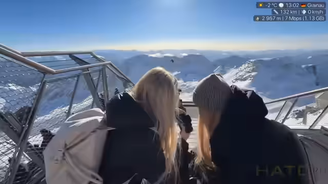03:56:04Nach der Gondelfahrt geht es mit einem Aufzug noch höher auf den eigentlichen Gipfelplateau der Zugspitze. Dort angekommen, ist die Streamerin von der Aussicht überzeugt und zeigt die spektakuläre Bergkulisse. Sie erinnert sich an einen Heiratsantrag, der an dieser Stätte stattgefunden hat, und wird selbst emotional. Sie nutzt den Zeitraum, um mit Sonja Fotos mit dem beeindruckenden Hintergrund zu machen und die besondere Erfahrung zu dokumentieren.