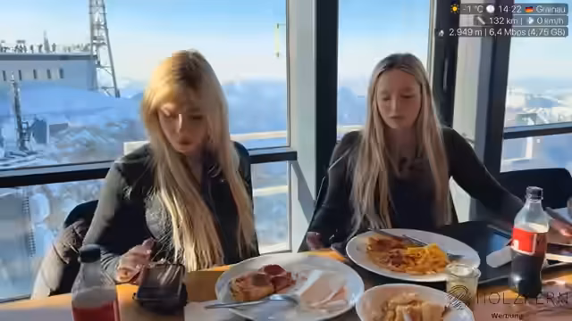 04:12:08Nach der Ankunft auf dem Gipfel wird der Titel des Streams zum 'höchsten Deutschlands' angepasst. Das Ziel ist nun, die Aussicht zu genießen und einzukehren. Nachdem sie einen Platz am Fenster gefunden haben, bestellen sie Currywurst mit Pommes. Der Service wird für seine Großzügigkeit gelobt, da die Portionen extrem üppig ausgefallen sind.