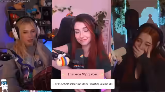 03:21:32Ein zentrales Thema des Streams ist die Frage, wie man mit einem Partner umgehen soll, der einem Hausttier mehr Aufmerksamkeit und Zuneigung schenkt als dem menschlichen Partner. Als Beispiel dient ein Szenario, bei dem ein Partner sich vorzugsweise mit dem Hund statt mit dem Partner auf der Couch kuschelt. Während manche das nachvollziehen können, da Tiere weich und warm sind, fühlen sich andere durch dieses Verhalten in ihren Bedürfnissen verletzt und als 'drittes Rad' angesehen. Die Meinungen gehen auseinander: Einige würden die Situation akzeptieren, solange sie selbst genug Zuneigung bekommen, während andere für sich in Anspruch nehmen würden, der Mensch in der Beziehung sei wichtiger als das Tier.