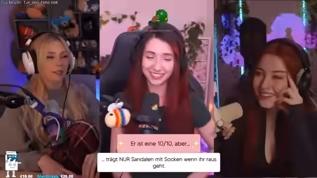 03:50:35Zum Ende des Streams kommt es zu einer ehrlichen und persönlichen Reflexion über die eigenen Makel. Die Streamerinnen diskutieren ihre eigenen Dealbreaker, also negative Eigenschaften, die sie bei sich selbst haben und die für andere problematisch sein könnten. Kim nennt ihren Hang dazu, andere ständig zu unterbrechen, was aus Angst entsteht, die Kontrolle zu verlieren. Sonja identifiziert ihre Tendenz, immer zu spät zu kommen und ein schlechtes Zeitgefühl zu haben. Weitere genannte Eigenschaften sind emotionale Stärke mit einer schnellen Zornesentladung, ein generelles Stresslevel und eine negative Grundstimmung in unklaren Zukunftssituationen.