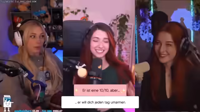 01:36:00Ein Hauptthema ist der Wunsch nach täglichen Umarmungen in Partnerschaften. Während einige dies als süß empfinden, wird die extreme Form, bei der der Partner jeden Tag, auch über große Distanzen, umarmt werden will, kritisch gesehen. Dies wird von Sonja als potenzielle 'Zwangsstörung' abgelehnt und auf eine niedrigere Attraktivitätsskala herabgestuft. Die Diskussion berührt auch das Bedürfnis nach persönlichem Raum und die Unmöglichkeit, mit jemandem zusammenzuziehen, dem man nicht vertraut.