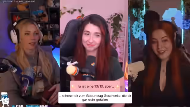 03:50:35Zum Ende des Streams sprechen die Teilnehmerinnen über ihre persönlichen Dealbreaker in Beziehungen. Genannt werden das Unterbrechen anderer, Unpünktlichkeit und Eifersucht, wobei betont wird, dass jeder Mensch seine Fehler hat und daran arbeitet. Es wird hervorgehoben, dass es wichtig ist, sich seiner eigenen Schwächen bewusst zu sein und daran zu arbeiten. Abschließend wird Lola, eine weitere Person, in den Stream geholt. Es wird angekündigt, dass es zukünftig gemeinsame Streams mit Lola geben wird, sowohl mittags auf ihrem Kanal als auch abends auf dem Kanal der Streamerin. Geplant sind unter anderem Kochstreams. Die Zuschauer werden gebeten, die Social-Media-Kanäle der Streamerinnen im Auge zu behalten, um genaue Informationen zu den Streaming-Zeiten zu erhalten. Der Stream wird mit Dankesworten an die Zuschauer und einem Abschiedslied beendet.