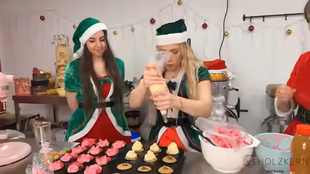 03:30:03Die Streamerinnen demonstrieren verschiedene Spritztechniken für die Buttercreme-Verzierungen, darunter Rosen und Tannenbäume. Die Interaktion mit dem Chat ist geprägt von humorvollen Bemerkungen über das 'Loch' in den Cupcakes und das Dekorieren. Während des Prozesses testen sie verschiedene Farben wie Rosa und Grün und experimentieren mit Goldglitzer für eine festliche Optik. Es werden auch Vergleiche zu Cupcake-Workshops gezogen, die bei Junggesellinnenabschieden beliebt sind.