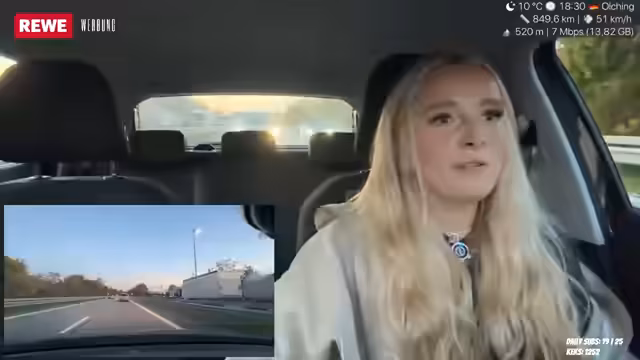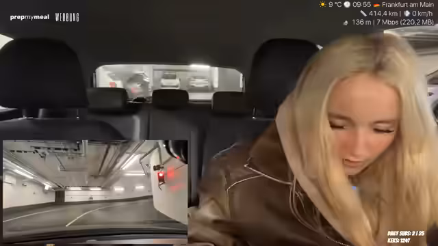 09:41:07Während der Fahrt kommt die Streamerin auf das Thema Kaugummi-Schlucken zu sprechen und verteidigt es als harmlos, da es sich um ein weit verbreitetes Missverständnis (Fake News) handele, dass dies schädlich sei. Sie vergleicht es mit dem Verzehr von Mais, der ebenfalls unverdaulich ausgeschieden wird, und sieht den Vorteil darin, die Umwelt nicht zu belasten, wenn kein Mülleimer zur Verfügung steht. Anschließend beginnt eine lange und frustrierende Parkplatzsuche in München, die sich als äußerst schwierig erweist. Sie äußert ihren Unmut über die überfüllten Straßen und die Schwierigkeit, einen freien Parkplatz zu finden, was sie an frühere Erlebnisse erinnert, bei denen sie und ihr Freund aufgrund fehlender Parkmöglichkeiten wieder nach Hause fahren mussten.
