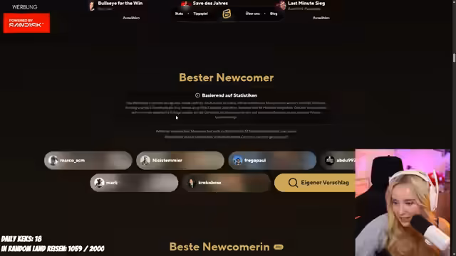 00:19:06Die Streamerin geht mit dem Chat in die Abstimmung der Stream Awards und zeigt die verschiedenen Kategorien. Sie ist besonders nominiert in der Kategorie "Newcomer of the Year" und äußert sich zu den Kriterien dieser Kategorie. Sie erklärt, warum sie sich in dieser Kategorie wiederfinden kann, trotz bereits vier Jahren als Streamerin, da ihr Wachstum in bestimmten Phasen sehr schnell war.