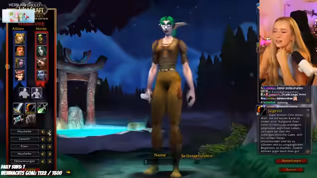 01:07:03Nach dem Quiz erstellt die Streamerin einen weiblichen Nachtelf-Jäger in WoW Classic. Sie personalisiert den Charakter detailliert (Frisur, Augen-Tattoos, Haarfarbe) und besprucht Haustier-Optionen wie Bären oder Wildschweine für das Leveling. Mit der Community plant sie die Aufteilung in zwei Teams, um das gemeinsame Leveln zu erleichtern.