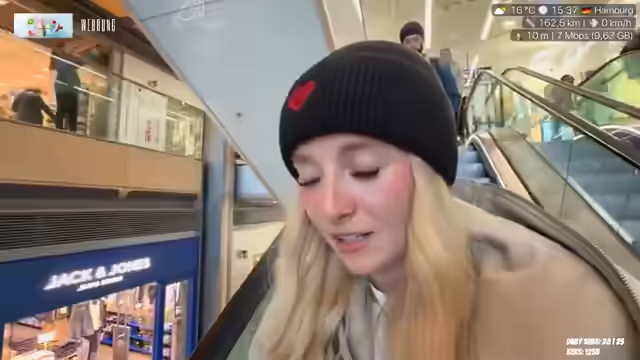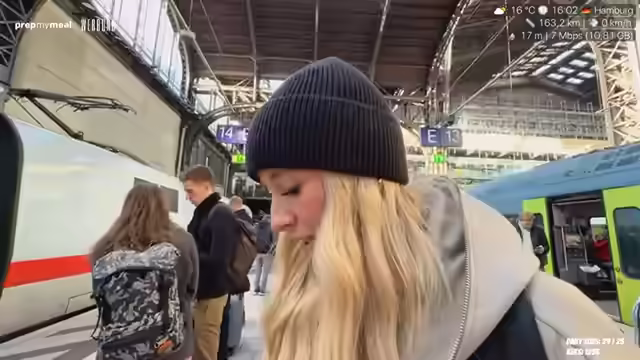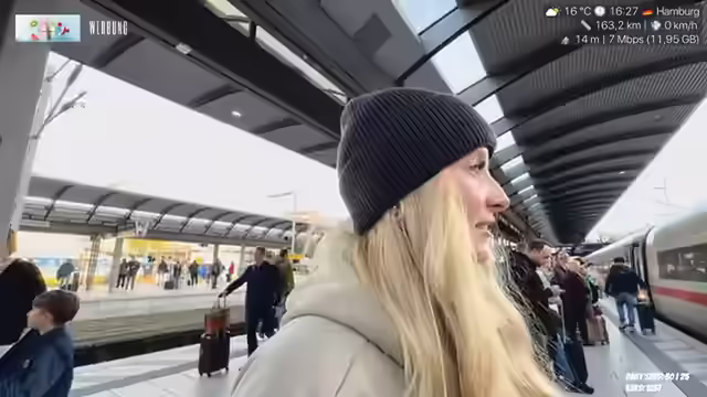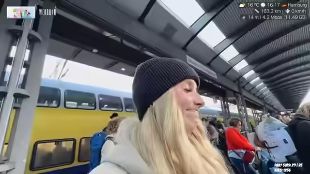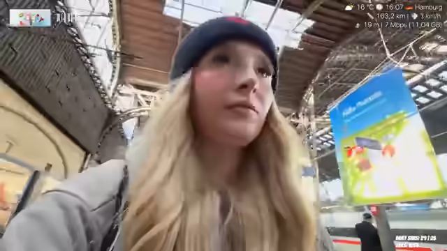 00:24:17Die Streamerin erreicht den Hauptbahnhof und erwähnt ein chinesisches Restaurant in der Nähe, das sie gerne besucht hätte, wenn sie länger geblieben wäre. Sie ist froh über die Schließfächer am Bahnhof. Es wird kurz überlegt, ob man Hilfe beim Tragen des Koffers in Anspruch nehmen soll, aber verworfen. Es wird über Schwierigkeiten gesprochen, jemandem zu sagen, wenn einem etwas nicht gefällt, und dass dies fast jedem schwerfällt. Der Streamerin fällt auf, dass ihr Koffer nicht gut rollt. Hamburg wird als dreckiger als München empfunden, aber dennoch als coole Stadt wahrgenommen. Am Bahnhof angekommen, erkundigt sie sich nach dem Weg zur S2 und stellt fest, dass sie am Gleis 4 abfährt. Es wird ein Franzbrötchen und ein Latte Macchiato gekauft. Da es nicht erlaubt ist am Bahnhof zu filmen, muss sie den Bahnhof verlassen.