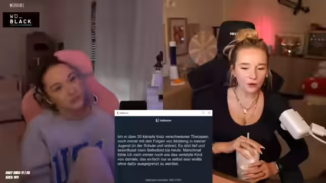 05:39:40Ein sehr emotionaler Abschnitt des Streamings widmet sich den langanhaltenden Folgen von Mobbing in der Kindheit und Jugend. Eine Person teilt, dass sie trotz mehrerer Therapien nach wie vor unter den experiences leidet und Schwierigkeiten hat, zu akzeptieren, dass sie nicht weniger wert ist als andere. Der Streamer spricht von der schwerwiegenden Wirkung von Mobbing, da es in der prägendsten Zeit des Lebens stattfindet und die Persönlichkeitsentwicklung massiv beeinträchtigt. Er sensibilisiert das Publikum für das Thema und empfiehlt, sich über die Folgen von Mobbing zu informieren.
