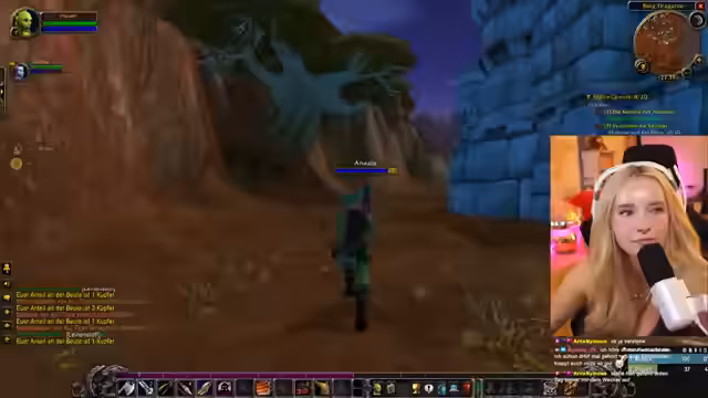 02:38:42Nach dem Verlassen der Höhle geht es zurück nach Durotar. Die Streamerin stellt fest, dass sie neue Fähigkeiten lernen muss, um stärker zu werden. Sie sucht nach einem Lehrer, um ihre Zauber zu erweitern. Dabei gibt es technische Unannehmlichkeiten, da sich die Tastenbelegung und die Ausrüstungsleisten nicht wie gewünscht anpassen lassen. Gleichzeitig wird das Inventar voll, und sie verkauft überflüssige Gegenstände, um Platz zu schaffen. Ein Questgegenstand, eine Tasche, wird fälschlicherweise verkauft, was zu Frustration führt.