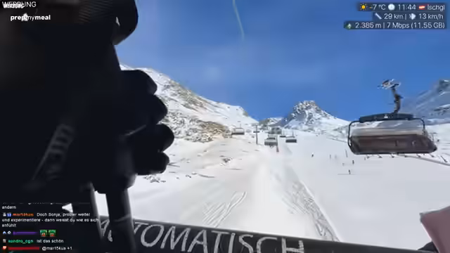 03:21:57Während der Fahrt auf der Piste kommt es immer wieder zu kurzen technischen Unterbrechungen, da die kabellosen Übertragungsgeräte Probleme bereiten. Die Streamerin muss die Verbindung mehrmals zurücksetzen, um den Stream aufrechtzuerhalten. Trotz dieser Herausforderungen bleibt die Stimmung gut und man konzentriert sich auf das Skifahren. Die Streamerin und Sonja nutzen die Zeit, um ihre Skitechnik zu üben, insbesondere das Bremsen und Kurvenfahren. Sie experimentieren mit verschiedenen Techniken, um sicherer auf den Skiern zu stehen, und diskutieren über den Unterschied zwischen Skifahren und Snowboarden. Die Streamerin erwähnt, dass sie Schwierigkeiten hat, die richtige Balance und das Bremsen zu meistern, aber sie ist motiviert, daran zu arbeiten, um ihre Fähigkeiten zu verbessern. Die Aussicht vom Berg wird als atemberaubend beschrieben und man genießt die Fahrt, auch wenn es zwischendurch immer wieder kleine technische oder körperliche Herausforderungen gibt.