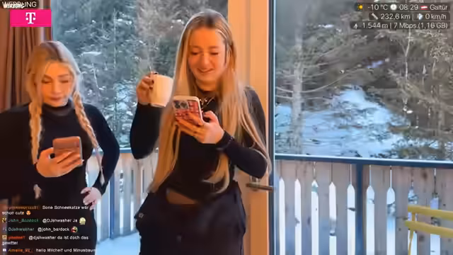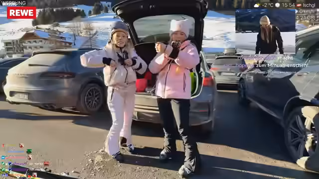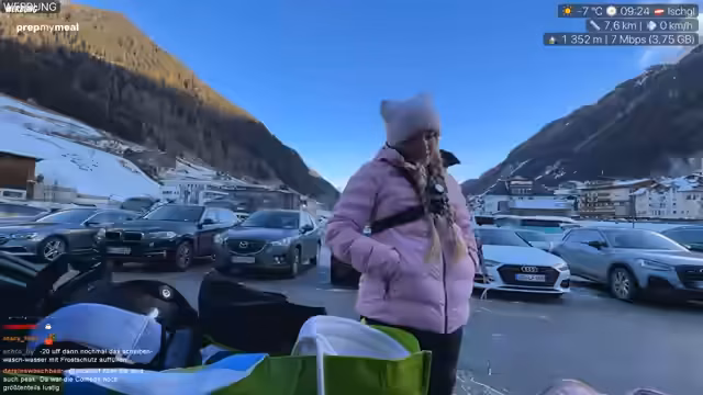 07:53:45Nachdem Nina erwähnt hat, wegen des Pime in der Sauna zu sein, beginnt der Stream. Die Streamerin versucht, den Streamer zu kontaktieren, der jedoch nicht erreichbar zu sein scheint. Danach tauchen verschiedene Namen wie Quavro, Becci Bex und Chad im Chat auf, die jedoch nicht auf Aktionen, sondern auf Spenden und Ähnliches bezogen sind und daher ignoriert werden. Die Streamerin und ihre Begleiterin Becci sind im Begriff, das Hotel zu verlassen, um nach Ischgl zu fahren. Sie tauschen ihre Skischuhe gegen normale Schuhe und bereiten sich auf den Ausflug vor.