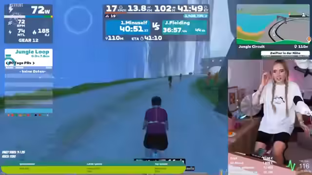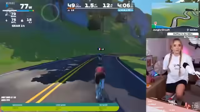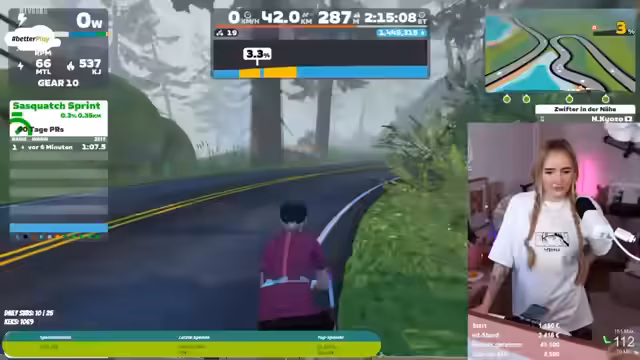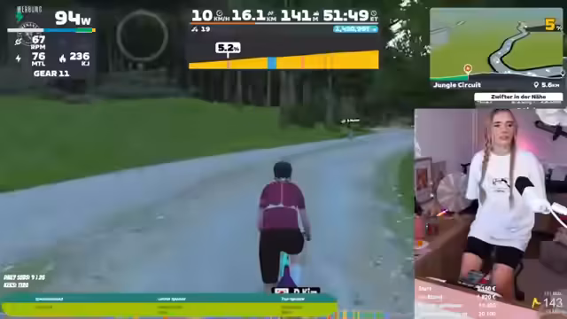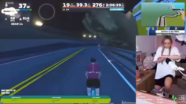 02:00:03Der Streamer beginnt das Radfahren auf der Plattform Zwift, um die Charity-Zusage zu erfüllen. Es kommt zu mehreren technischen Problemen, darunter fehlende Maussteuerung, unausgeglichene Lautstärke zwischen Spielgeräuschen und Musik, sowie die Unannehmlichkeit des Rennradsitzes. Die Motivation durch die Community und die visualisierte Strecke werden hervorgehoben, während der Streamer durch das Treten gequält wird.