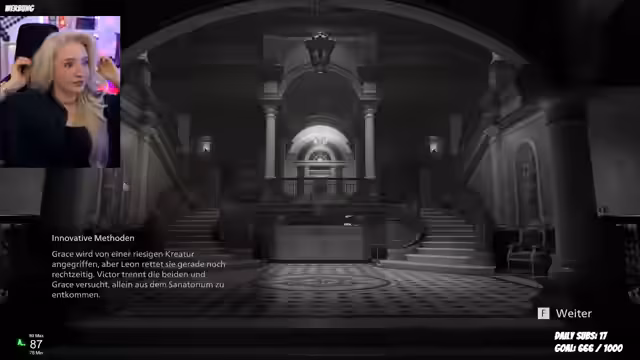 02:51:31Nach einem kurzweiligen Plausch über neue Follower und anhaltende technische Anpassungen, wurde das Spiel 'Resident Evil' fortgesetzt. Im Spiel befand sich die Streamerin in einer Quarantänestation und musste Zombies bekämpfen. Ihre große Angst vor Untoten wurde dabei deutlich, was sie zu einem sehr vorsichtigen 'Slowrun' im Spiel zwang. Ein besonderes Highlight war das Erreichen eines Meilensteins von 48 Monaten durch einen Follower.