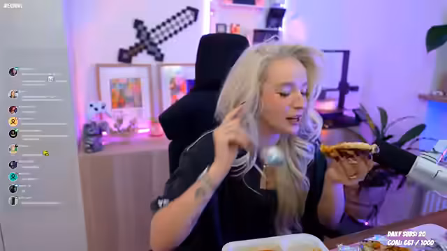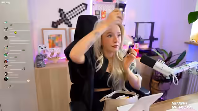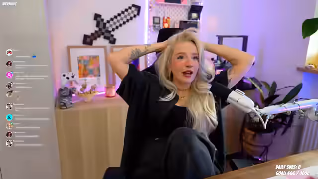 00:16:01Der Stream beginnt mit dem Streamer, der einen neuen Raum vorstellt und umgeräumt hat. Hauptthema ist das Ausprobieren einer neuen blonde Perücke aus dem TikTok-Shop für 20 Euro, die jedoch ohne Kleber nur aufgesetzt ist und noch nicht optimal sitzt. Parallel dazu wird der Gesprächsfluss unterbrochen durch Spenden, Subs und Geschenke, während der Streamer mit dem Aufsetzen und Anpassen der Perücke sowie seinem Make-up beschäftigt ist und interaktiv mit der Community spricht.