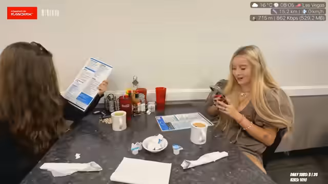 01:14:42Der Streamer spricht über anstehende Termine in Deutschland. Direkt nach der Rückkehr aus Las Vegas landet sie in Frankfurt und hat am Folgetag einen Sponsored Stream in Köln. Sie äußert ihre Freude über die Reise, ihre Dankbarkeit für die Einladung und ihren Wunsch, wiederzukommen, um mit anderen Streamern zusammenzuarbeiten. Das Streamen im Diner und das Erleben der amerikanischen Kultur werden als positives Highlight hervorgehoben.