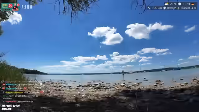 00:30:05Die Fahrt auf dem Ammersee beginnt. Der Streamer steigt ins Wasser und muss sich die Schuhe ausziehen, was zu einem sandigen Problem führt. Das Board wird nach dem Betreten des Wassers gereinigt. Die Fahrt verläuft ruhig und der Streamer berichtet von dem Vogelschutzgebiet, das er ansteuert. Er beschreibt das dortige Vogelleben und macht sich Sorgen um den Wellengang, der die Technik beschädigen könnte. Einige Zuschauer im Stream scheinen sich mit den regionalen Besonderheiten auszukennen.