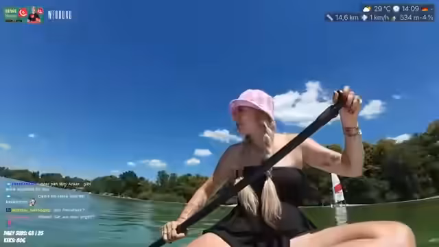 01:20:11Während der Tour sichtet die Streamerin plötzlich mehrere Personen auf Paddleboards, die nackt sind. Dies führt zu großer Verwirrung und Panik bei ihr, die im Chat deutlich wird. Sie äußert sich zwiegespalten: Einerseits findet sie Nacktsein normal und befreiend, andererseits stört sie es, wenn es exzessiv ausgelebt wird, besonders in der Nähe von Kindern. Sie paddelt eilig weg, um nicht auf die Situation schauen zu müssen, und ist erleichtert, als sie die nackten Personen hinter sich lässt. Auch die Technik bereitet Probleme, das Handy wird sehr heiß.