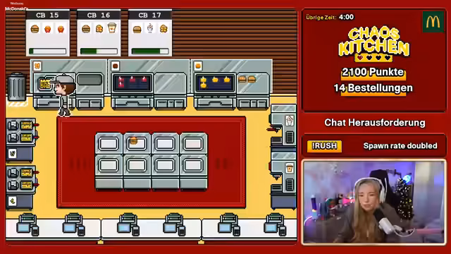 03:45:10Nach dem Quiz folgt als letzte Station des Max Season Pass das angekündigte Minigame. Es handelt sich um ein Cooking-Spiel, bei dem Bestellungen in einer McDonald's-Küche zubereitet werden müssen. Der Streamer erklärt die Steuerung (Pfeiltasten und Leertaste) und kündigt an, dass die Community während des Spiels durch Rush-Befehle im Chat unterstützen kann.