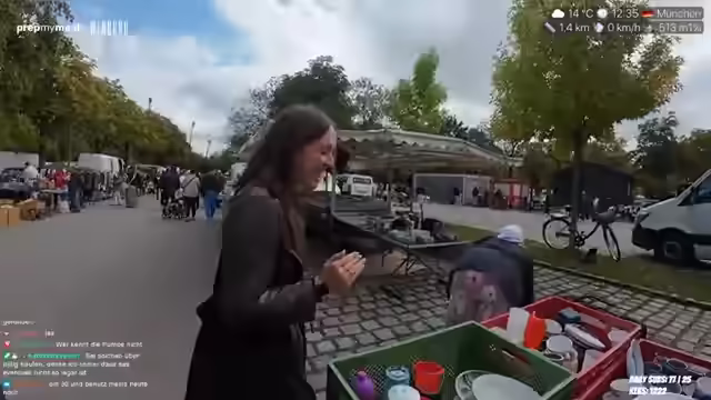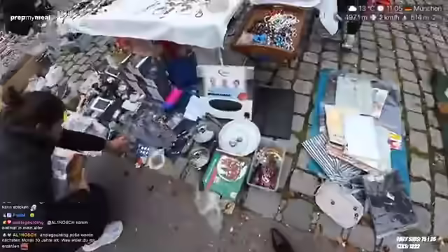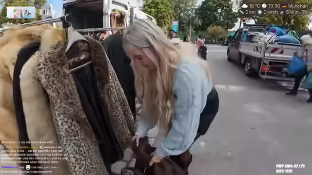 02:56:21Es wird überlegt, ob man zu einem Stand zurückkehren soll, an dem Hüte verkauft werden, die so geschmackvoll präsentiert wurden, dass man nicht weitergekommen ist. Die Begeisterung für eine Mini-Uhr wird geteilt. Es wird über ein Handyspiel namens Last War gesprochen, von dem man süchtig ist. Periodenunterwäsche wird als Thema angesprochen, für das eine Anfrage abgelehnt wurde. Eine Tattoo-Maschine wird entdeckt und über die Angst vor dem Tätowieren gesprochen. Eine Kamera wird als guter Fund gelobt und es wird überlegt, wie man sie auf Partys und Events nutzen kann. Der Chat wird nach seiner Meinung zu Trachten bei Männern gefragt. Der Kauf eines pinken Helms wird erwähnt. Es wird der Wunsch nach einem Gemälde im Haus geäußert. Ein alter Mantel aus echtem Pelz wird als cool empfunden, aber der Neukauf von Pelz wird abgelehnt. Es wird ein Stand mit Artikeln für 1 Euro entdeckt. Ein Bild von sich selbst wird in einen Traschen gesteckt. Die Überlegung, Waschmittel für 1 Euro zu kaufen, wird aufgrund von Unklarheiten bezüglich der Verwendung der Bilder verworfen. Die Frage, ob man angesprochen wird, wird beantwortet und es wird erwähnt, dass jemand nicht gefilmt werden wollte. Es werden Artikel mit einer Schnur entdeckt und der Wunsch nach einem pinken Exemplar geäußert. Eine Uhr, die an einer Tasche befestigt werden kann, wird als fancy empfunden.