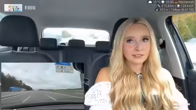 00:11:50Ein Großteil des Streams beschäftigt sich mit den Herausforderungen des Autofahrens, insbesondere mit einem leistungsarmen Auto ohne Tempomat oder Apple CarPlay. Sie schildert Frust über andere Verkehrsteilnehmer, die auf der mittleren Spur langsam fahren oder aggressiv überholen. Die Reisezeit nach Frankfurt wird auf etwa zweieinhalb bis drei Stunden geschätzt und die aufwändige Planung der Reise mit Technikequipment wird deutlich.