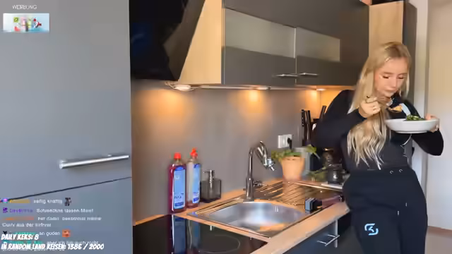 04:35:07Die Kochsession beginnt mit der Fertigstellung der Kartoffeln, die im Airfryer zubereitet wurden und laut Streamerin lecker schmecken. Parallel dazu wird über die eigene Küche gesprochen, die zwar aus Billigmodellen besteht, aber nach wenigen Jahren Mängel aufweist, wie ein sich verbiegender Korpus eines Schranks, der fast von der Wand bricht. Diese persönlichen Geschichten über die eigene Mietwohnung und deren unzureichende Einrichtung dienen als lockere Ablenkung während des Kochvorgangs.