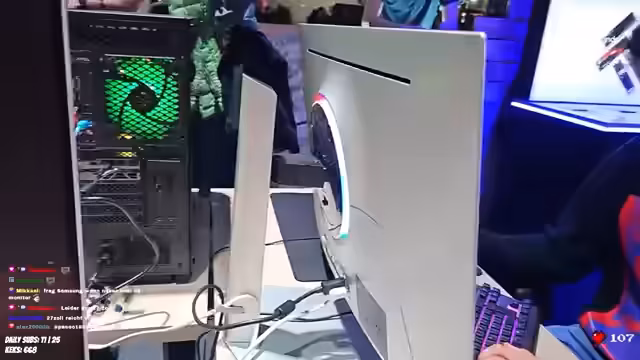 06:10:19Der Streamer besucht den Samsung-Stand, wo er drei Monitore ausprobieren kann. Er zeigt sich begeistert von den Geräten und erwähnt, dass er sich einen OLED-Monitor abgeholt hat, der bei der Post beschädigt wurde, aber funktionstüchtig ist. Während seiner Präsentation versucht er, verschiedene Monitore darzustellen, wobei er sich insbesondere auf einen großen Curved-Monitor und einen Odyssey OLED G81SF konzentriert und beeindruckt von deren Bildqualität ist.