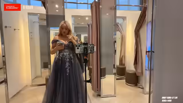 01:27:34Nach intensivem Probieren und Abwägen entscheidet sich die Streamerin für ein dunkelgrünes Kleid mit Blatt- und Perlendetails, das ihr sofort gefallen hat. Sie ist sich fast sicher, dieses Kleid zu kaufen. Sie erklärt, dass sie dunkle Farben bevorzugt, um Kontrast zu ihren blonden Haaren zu schaffen und dass sie keine Farbe tragen möchte, die von anderen Streamern bereits getragen wurde, da das ein ungeschriebener Kodex sei.