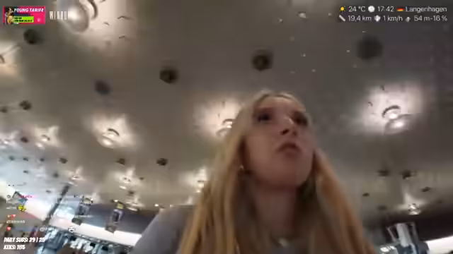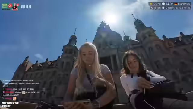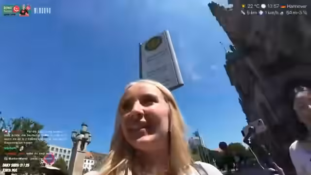 00:11:48Der Streamer läuft durch Hannover und bemerkt die vielen Blicke der Passanten, die sie als respektlos empfindet. Sie plant, mit einem Überraschungsgast ein Café zu besuchen, eventuell eine Tour mit dem Glasfahstuhl zum Rathaus oder mit Scootern über den Maschsee zu machen. Sie erwähnt auch die Muskelkater vom Kartfahren am Vortag und die dabei angetroffene Hitze.
