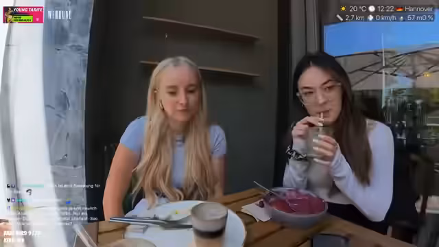01:00:38Der Streamer erreicht ein Café in Hannover, wo sie auf ihren Überraschungsgast wartet. Sie ist müde von gestrigem Kartfahren, zeigt aber gute Laune. Sie bemerkt die laute Umgebung und überlegt, ein externes Mikro zu nutzen. Der Gast ist im Stau, was aber als nicht schlimm empfunden wird. Sie interagiert mit dem Chat über Matcha-Getränke und andere Themen.