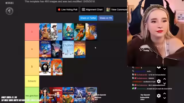 01:50:46Die Streamerin beginnt mit ihrer Tierlist für animierte Disney-Filme, wobei S-Tier das Beste und E-Tier das Schlechteste ist. Sie platziert Aladdin in A-Tier, da sie ihn als Kind sehr gerne gesehen hat. Toy Story landet in B-Tier, obwohl sie ihn liebt und sich gerne wieder ansehen würde. Chicken Little wird ebenfalls in B-Tier eingeordnet, da sie sich nicht mehr so gut daran erinnern kann, ihn aber auch nicht schlecht fand. Die Community beteiligt sich an der Diskussion und teilt ihre Meinungen zu den Filmen. Die Streamerin äußert, dass sie nicht so der Fan von Liebesgeschichten ist.