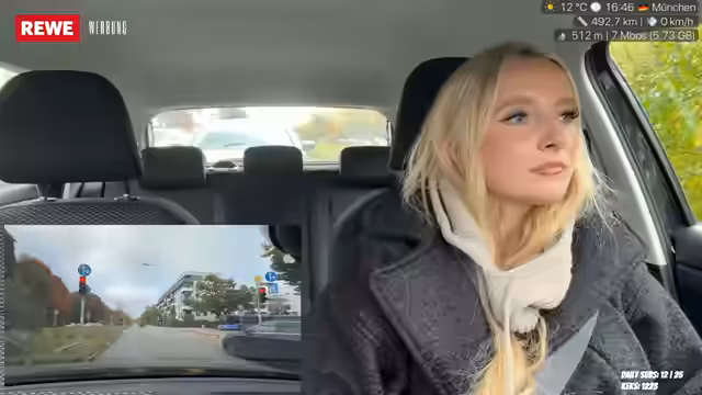 00:40:09Nach einem kurzen, erfolglosen Versuch, in der Werkstatt Apple CarPlay aktivieren zu lassen, fährt die Streamerin zum Startpunkt der Stadtführung. Sie erwähnt ihr Fantasie-Outfit für die Buchmesse. Der Verkehr in München wird als aufregend empfunden, und sie bleibt geduldig im Auto, da sie den Bus nicht verpassen möchte. Sie kommuniziert gleichzeitig mit dem Chat und bereitet sich auf den Teil des Streams vor, der draußen stattfinden wird.
