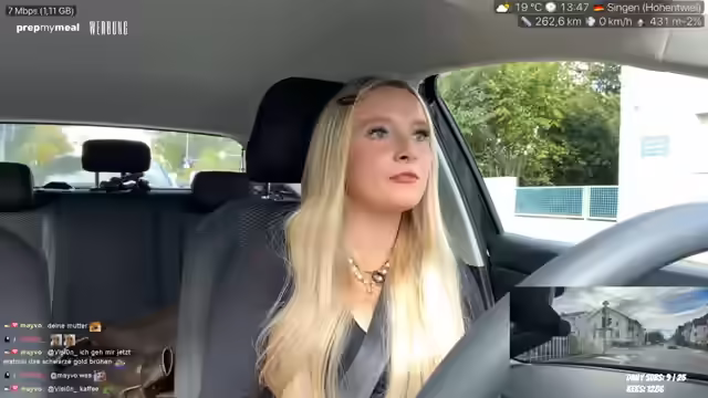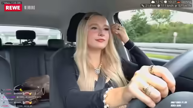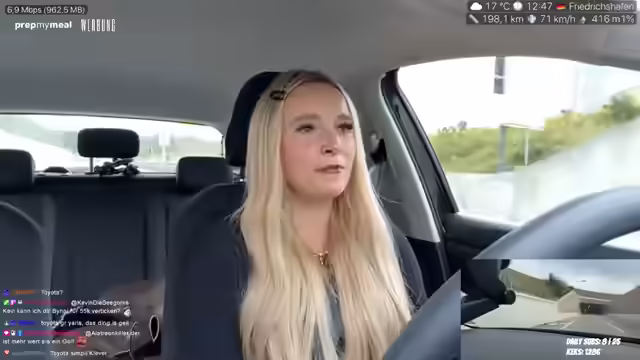 00:46:21Die Streamerin entdeckt einen neuen Kratzer an ihrem Auto und äußert ihren Frust darüber. Sie erwähnt frühere Vorfälle von Fahrerflucht und bedankt sich für die Glückwünsche. Es wird ein Geschmackstest angekündigt, und die Streamerin äußert Bedenken wegen möglichen Sodbrennens. Sie ist jedoch positiv überrascht vom Geschmack des Getränks, das leicht säuerlich, aber auch süß ist. Es wird festgestellt, dass das Getränk zuckerfrei ist. Die Streamerin hat ein Problem mit ihrer Kontaktlinse und erwähnt, dass sie ihre Freundin in der Schweiz besucht. Sie versteht den schottischen Dialekt nicht gut und fragt nach den Frühstückszeiten bei McDonald's. Es wird überlegt, bei Burger King etwas zu essen zu holen, um den Koffeinkonsum auszugleichen. Die Streamerin fährt in Richtung Landsberg am Lech und lässt sich von den Zuschauern navigieren.