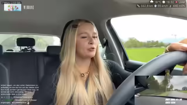 02:18:59Es wird festgestellt, dass es scheinbar keine Toilette mehr gibt und die Streamerin in der nächsten Ausfahrt abfahren muss, um in die Büsche zu pinkeln, obwohl wild pinkeln verboten ist. Sie muss das Handy ausmachen. Sie äußert ihren Ärger darüber, dass ein Auto vor ihr langsam fährt, obwohl sie abbiegen muss. Trotzdem bewundert sie die Alpen. Die Streamerin hat extra nachgefragt, ob die Schweiz in ihrem Mobilfunkvertrag enthalten ist. Sie findet es süß, dass ihre Haarspange so gemocht wird. Sie liebe es, dass ihre Zuschauer wissen, dass sie Döner liebt. Die Streamerin befindet sich auf einer Bundesstraße und hat bereits eine Vignette für die Schweiz. Sie muss dringend pinkeln und hofft, bald einen McDonald's oder ähnliches zu finden.