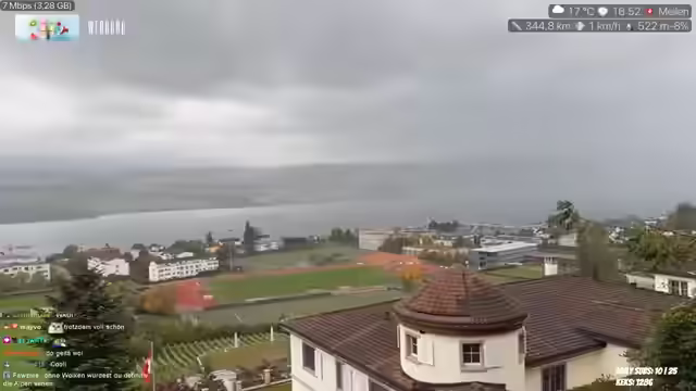 06:57:27Der See am Aussichtspunkt soll bei Sonnenschein besonders blau aussehen. Es wird das Gefühl beschrieben, dass der Aussichtspunkt vielleicht doch nicht so cool ist. Es wird der Wunsch geäußert, wandern zu gehen, aber der Stream soll nicht abschmieren. Es wird ein Achtung-Kanzeschild gesehen und erwähnt, dass Kinder mit der Gondel zur Schule fahren. Der gewählte Punkt scheint mitten auf der Straße zu liegen, aber es wird ein Platz zum Anhalten gefunden. Die Aussicht soll trotz des windigen Wetters genossen werden. Die Mikros werden angebracht, um den Wind abzuschirmen. Die Kameraeinstellungen werden angepasst, um die Aussicht besser einzufangen. Es wird festgestellt, dass es hinten regnet und dass gutes Wetter die Wirkung verstärken würde. Die Zuschauer können die Alpen besser sehen, da die Kamera besser geworden ist. Der Regen nähert sich schnell und es wird beobachtet, wie der Hintergrund verschwindet. Der Regen ist etwa 50 Meter entfernt. Der See ist nun nicht mehr erkennbar. Es wird bedauert, dass das Wetter so schlecht ist, aber die Qualität der Kamera wird gelobt.