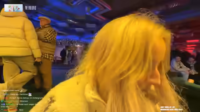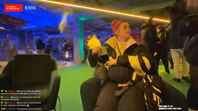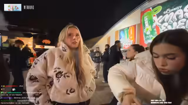 04:01:14Nach der Anreise mit dem Shuttle beschreibt die Streamerin die Ankunft am Eventgelände. Sie zeigt ihren Ausweis zur Identifikation. Vor Ort ist es sehr voll, es gibt lange Schlangen beim Einlass und viele betrunkene Menschen. Sie erwähnt positive Aspekte wie ein Weihnachtsbaum und Domino's Pizza. Ihre Freundinnen sind ebenfalls vor Ort, aber noch nicht fertig mit Vorbereitungen. Die Streamerin reflektiert über ihre sozialen Ängste: Früher wäre es für sie ein Albtraum gewesen, alleine zu Events zu gehen, aber durch das Streaming hat sie sich entwickelt und challenged sich selbst.
