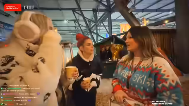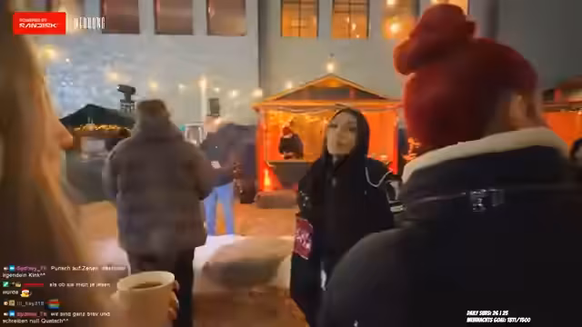 06:57:15Nach der Challenge erkunden die Teilnehmer den Weihnachtsmarkt. Dabei gibt es Begegnungen mit weiteren Personen, darunter Jasmin und Montee. Es werden Geschenkkäufe diskutiert und Erinnerungen an Flohmärkte geteilt. Die Atmosphäre ist geprägt von Gemeinschaft und entspannten Unterhaltungen. Parallel dazu laufen technische Anpassungen am Stream, um die Audioqualität bei den Hintergrundgeräuschen zu verbessern.