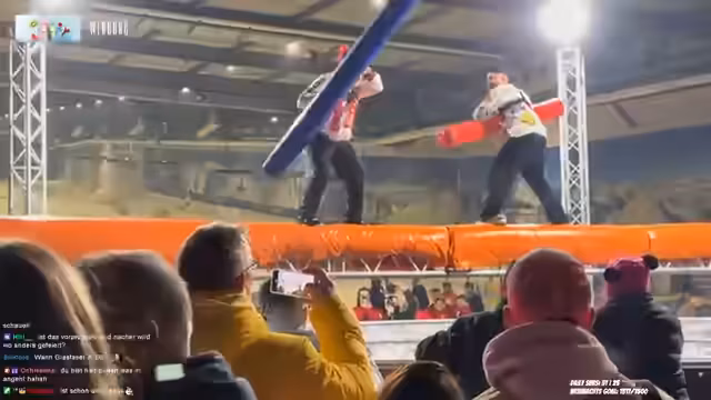08:03:20Die Atmosphäre wird angespannt, da bevorstehende Wettbewerbe (wie einen Gladiator-Kampf) diskutiert werden. Anna bereitet sich auf einen Sprung vor, während der Streamer seine Angst vor Höhe und Verletzungen ausdrückt. Es geht um die Regeln des Events und die Nervosität der Teilnehmer, besonders im Hinblick auf mögliche Stürze und physische Risiken.