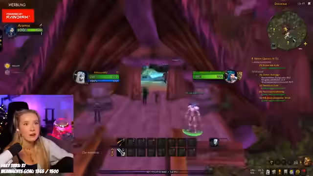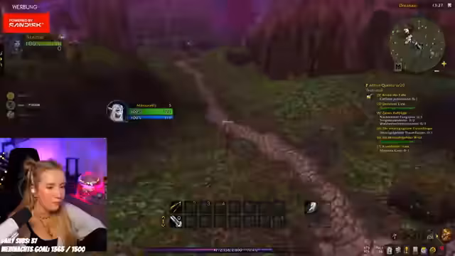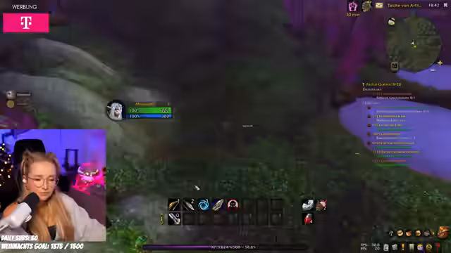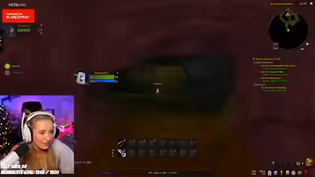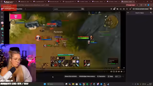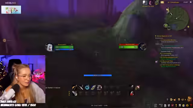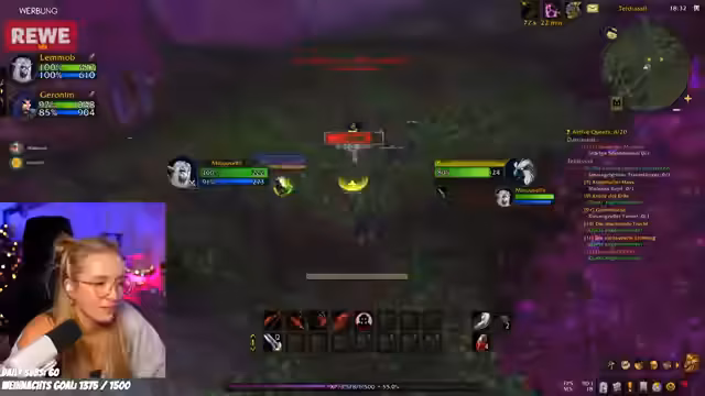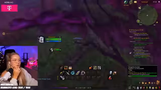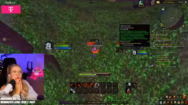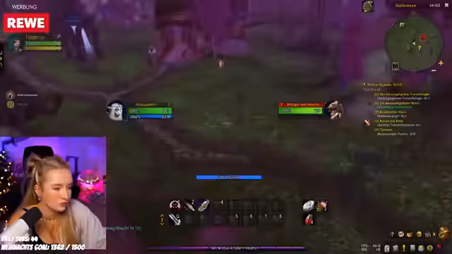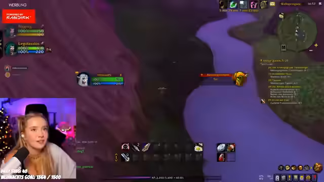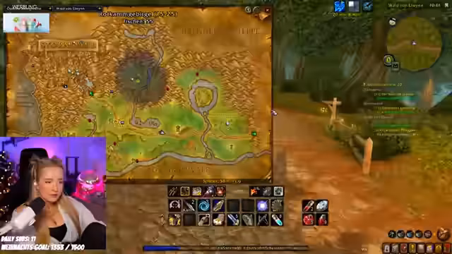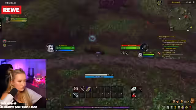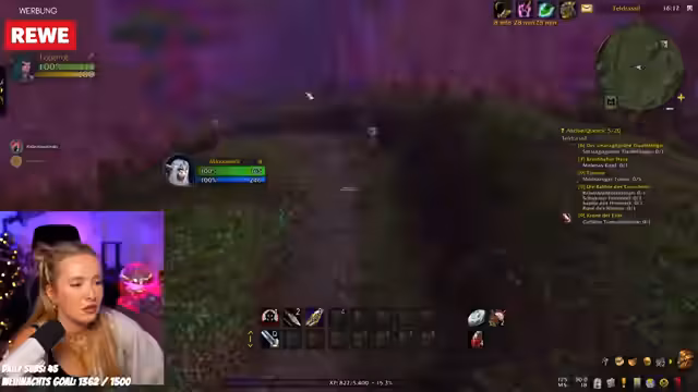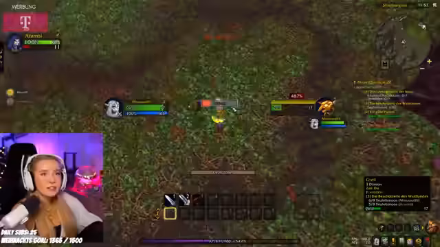04:40:41Nach dem Wechsel in World of Warcraft beginnen die Spieler mit Questing in Startgebieten. Es geht um das Annehmen von Aufträgen, das Teilen von Gegenständen und das Verkaufen unnötiger Items. Der Streamer stirbt mehrfach (Todeszähler steigt auf Minus 3), was zu Diskussionen über Motivation und Frust führt. Er übt Kiting (Gegner durch geschicktes Laufen und Schießen kontrollieren), kämpft gegen niedrige Level-Gegner wie Eulen und Katzen und bespricht Strategien mit Jasmin. Probleme mit dem Inventar und unerwartete Spawns von Gegnern erschweren den Fortschritt.