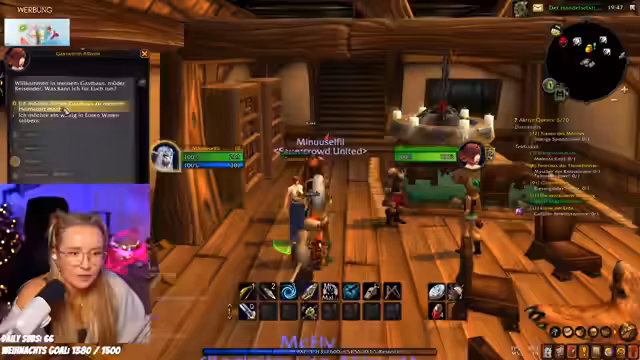 11:15:00In Westfalen kämpft die Gruppe gegen den Elite-Mob Hogger, wobei Strategien wie Aufteilung, Kiting und Heilung durch den Streamer (als Priestersimulator) diskutiert werden. Nach mehreren Versuchen und Respawn-Problemen besiegen sie Hogger schließlich. Dabei werden Level-Unterschiede (10-15) und Klassenfähigkeiten wie Sturmangriffe besprochen. Hinzu kommen Interaktionen mit NPCs und das Sammeln von Quest-Belohnungen wie Silber und Ausrüstung.